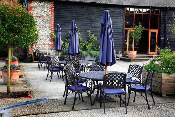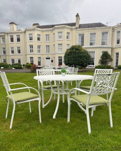 Produits que vous trouverez ici : Les tables Frances et Hannah avec les chaises Kate en bronze ancien.