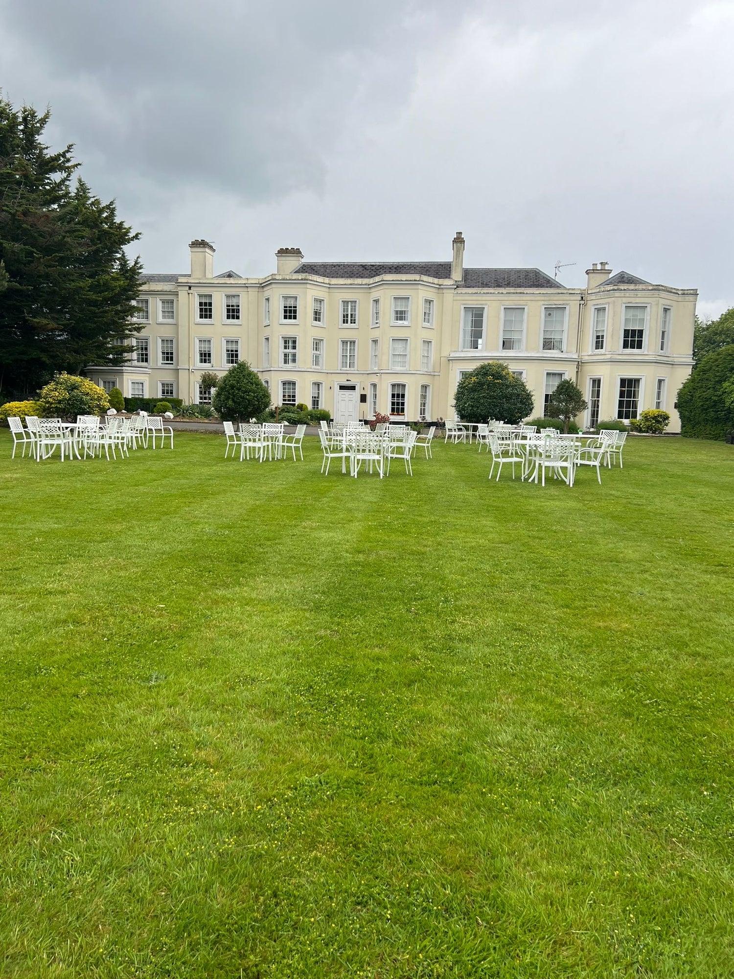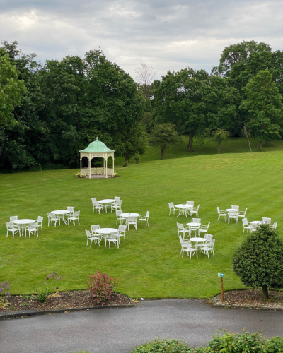 Produits que vous trouverez ici : Table Charlotte avec chaises empilables Jane en bronze ancien.