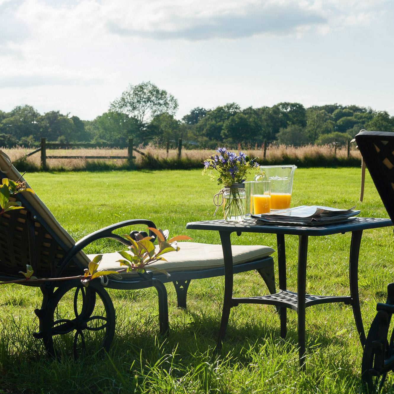 Produits que vous retrouverez ici : l'ensemble June 6 places avec chaises April, coussins et parasols en terracotta, et les transats Stella en bronze ancien.