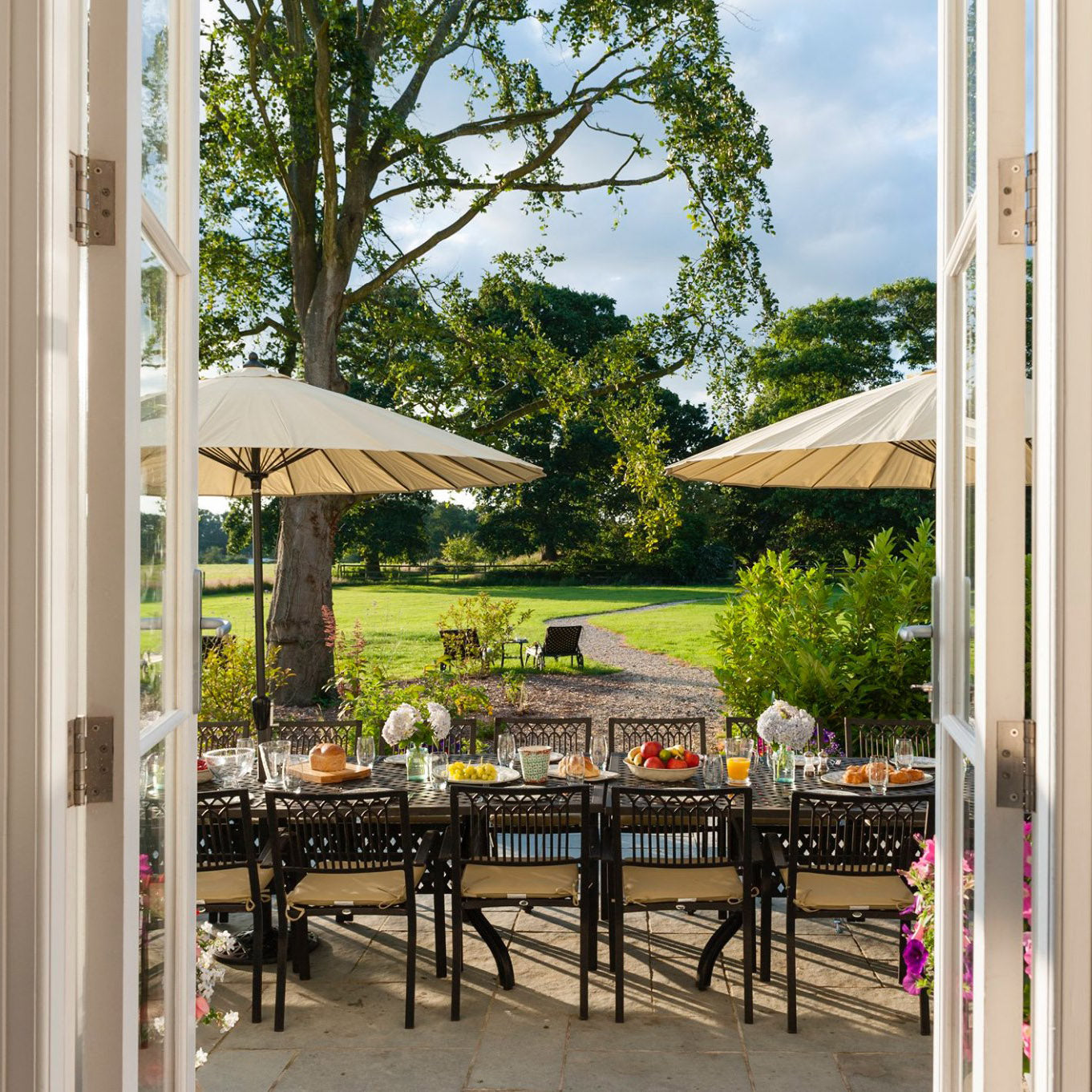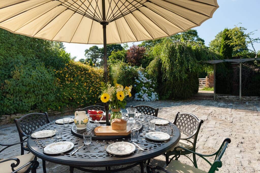 Produits que vous trouverez ici : la table Olivia avec Lazy Susan et parasol, accompagnée des chaises Kate en bronze ancien.