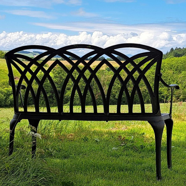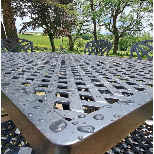 Produit que vous retrouverez ici : la table Madison avec les chaises April, et le banc April en bronze ancien.