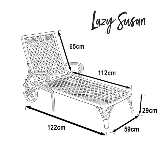 La chaise longue Rose en Gris Ardoise, vous assure d'apporter une touche instantanée de classe et d'élégance à tout jardin ou espace extérieur. D’une simplicité à assembler et à transporter, la chaise longue Rose ne pèse que 26 kg. Elle est fabriquée en aluminium moulé de qualité supérieure, ce qui signifie qu’elle ne rouillera jamais, ni ne pourrira et pourra être laissée à l’extérieur tout au long de l’année, sans nécessiter d'entretien. Se détendre au soleil n’a jamais été aussi confortable qu’avec la chaise longue Rose. Pour davantage de confort, choisissez un magnifique coussin parmi les options ci-dessus, proposé à un prix considérablement réduit et disponible dans 4 couleurs. Avez-vous besoin d’un endroit pour poser vos boissons tout en prenant un bain de soleil, allongé sur votre nouvelle chaise longue ? Pourquoi ne pas y ajouter une belle table d'appoint assortie à prix réduit ?