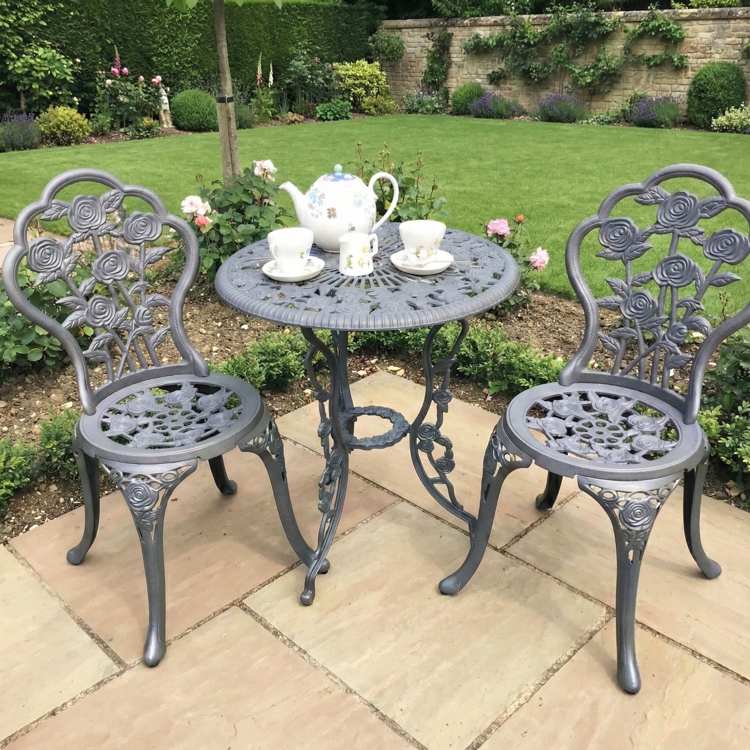 L'ensemble bistrot 2 places "London Rose" est une grande nouveauté ajoutée à notre mobilier de jardin. Le plateau de table est bordé de magnifiques roses et donne à chaque jardin une touche romantique dans le style typique des maisons de campagne anglaises. Celui-ci est également fabriqué en fonte d'aluminium durable et est résistant aux intempéries. Cela signifie que le mobilier ne rouille pas et qu'il est en même temps relativement léger et facile à manipuler. Vous pouvez donc rapidement faire passer cet ensemble de l'ombre au soleil, ou inversement, selon l'endroit où vous souhaitez déguster votre café. Un bon verre de vin au coucher du soleil ou un petit repas sera certainement bien plus agréable à notre table de bistrot London Rose.