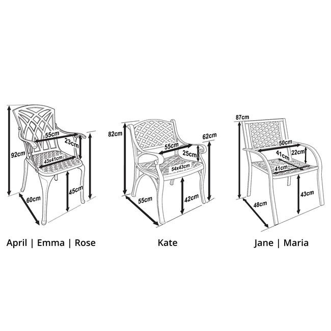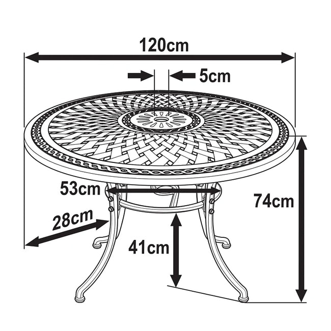 La table Alice ronde de 120 cm à quatre places est vraiment populaire parmi tous nos clients, plus de 150 avis positifs font l’éloge de cet ensemble de jardin. L'ensemble 4 place Alice est la taille idéale pour les repas en petit comité, mais est également disponible en ensemble à six places. La table d'un poids de 19 kg est fabriquée en fonte d'aluminium de haute qualité ce qui lui évitera de rouiller.